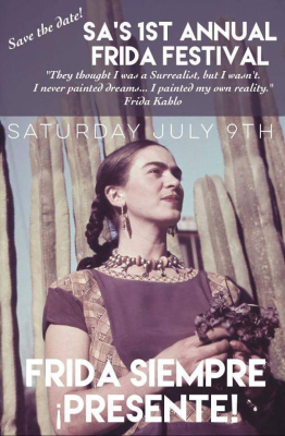Save the date for SA's first annual Frida Festival: Frida Siempre: ¡Presenté! Honoring the legacy of Mexican artist, Frida Kahlo this special festival will include a Frida inspired fashion show, all female visual art show, curated artisan market, food and music. Stay tuned for our call to artists!
