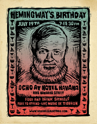 Ocho and the San Antonio Public Library Foundation's First Edition Society invite you to our fourth annual celebration of Ernest Hemingway's birthday on Saturday, July 19th, 7 – 11:30 pm. Enjoy live music by Tiburon, food and drink specials. There is no cover charge to attend.