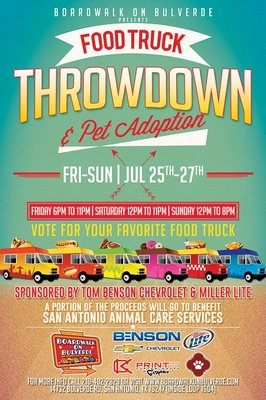 The 4th Annual Food Truck Throwdown & Pet Adoption is at Boardwalk on Bulverde July 25-27. Admission is FREE and Animal Care Services will be there with adorable adoptable animals that you can make the newest part of your family (adoption hours are Saturday 12noon-6pm & Sunday 12noon-5pm).