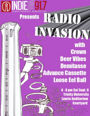 Indie Overnight Radio Invasion is the music event of the weekend! Chirs Maddin returns in absurdist form as Loose Eel Ball, an exercise in wordplay, outlandish behavior and sonic experimentation with SA pop contortionist Marcus Rubio. Back in town from a summer recording session at the Sonic Ranch in West Texas, Mike Carrillo and his indie orchestra Deer Vibes show off the work impending on their debut LP. Power trio Crown lets loose on the muscled, blues-rock riffs of their second release of the year Are These the Good Days? With Advance Cassette, DJ Gibb. Free, 4pm, Ruth Taylor Courtyard, Trinity University, 1 Trinity, (800) 874-6489