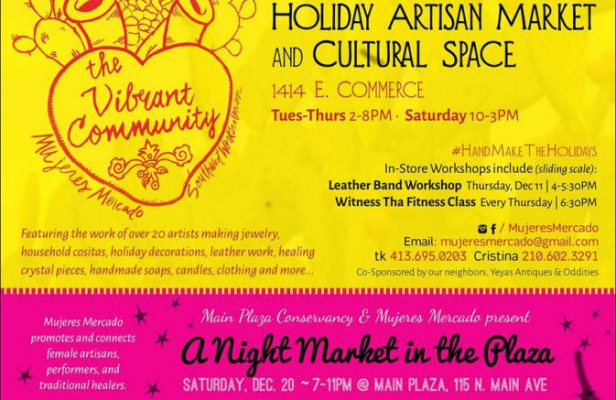 Main Plaza Conservancy and Mujeres Mercado announce a new Night Market at Main Plaza every third Saturday December 20, from 7p.m. to 11 p.m. The Night Market will feature food trucks, fashion, entertainment, handmade wares, beer & wine, and the state of the art video installation, The Saga to provide local residents and visitors the ultimate urban evening experience. The Night Market is being produced to create a destination event while showcasing the plaza’s public space possibilities and historic grandeur. To ensure success, the Main Plaza Conservancy has partnered with Mujeres Mercado–Mujeres Mercado creates local handmade marketplaces and cultural spaces that support & connect women artisans, traditional healers and merchants building alternative economies. When: December 20, from 7 p.m. to 11 p.m. **weather permitting** Where: Main Plaza 115 N. Main Ave San Antonio, Tx 78205 What: Food – variety of food trucks, Blue Star Icehouse, El Oasis Café, Cupcakes & more Drinks – Organic local craft beer and wine Vendors – Local made artists/sellers and artisan startups Entertainment – Live music, dancing, The Saga and more Activities – Varying by month --- educational and hands-on workshops for all ages & traditional healers will be on hand. Website: www.mainplaza.org