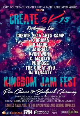 Performing Live:: Create 2K15 Camp K-Drama D-Maur Jarrell Von Won C. Martyr Purpose The Great RYU DJ Dynasty Kingdom Jam Fest 6:00pm-8:30pm (Doors open at 5:00pm for the pre-show concert) Free Concert and Backpack Giveaway (Limited availability for backpacks and school supplies) 0 Reviews
